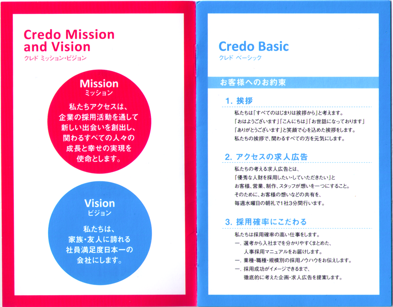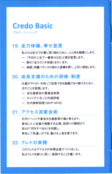 アクセスのクレドは、WISHパートナーズの指導の下、社員全員参加の「クレド作成合宿」を経て制定された。