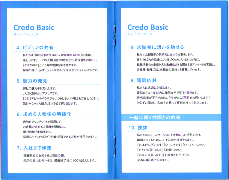 導入1年目はとりあえずクレドをつくること自体が研修で、2年目で変化が見え始めて、3年目でなんとか形になるくらいかもしれません。うちもそうでした。回り道のようですが、やはり組織としてのセルフイメージや価値観の部分を一度しっかり明文化して共有することが、結局は一番の近道になると思います」