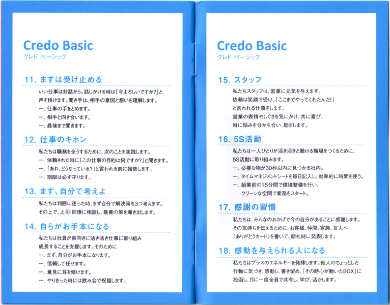 行動基準である「クレドベーシック」22項目のうち、前半10項目は「お客様に対するお約束」、後半12項目は「一緒に働く仲間との約束」だ。22項目ある「約束」の一つ一つに、社員全員で考えた「具体的な行動」、「その行動をする理由」、「約束を守れたかどうかを判断する基準」が表現されている。