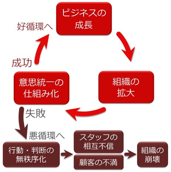 〈理念・価値観〉が共有されないまま組織が拡大していけば、スタッフの判断や行動はどこまでも無秩序になっていく。顧客の不満やスタッフの相互不信がつのり、やがては組織が崩壊しかねない(右図参照)。