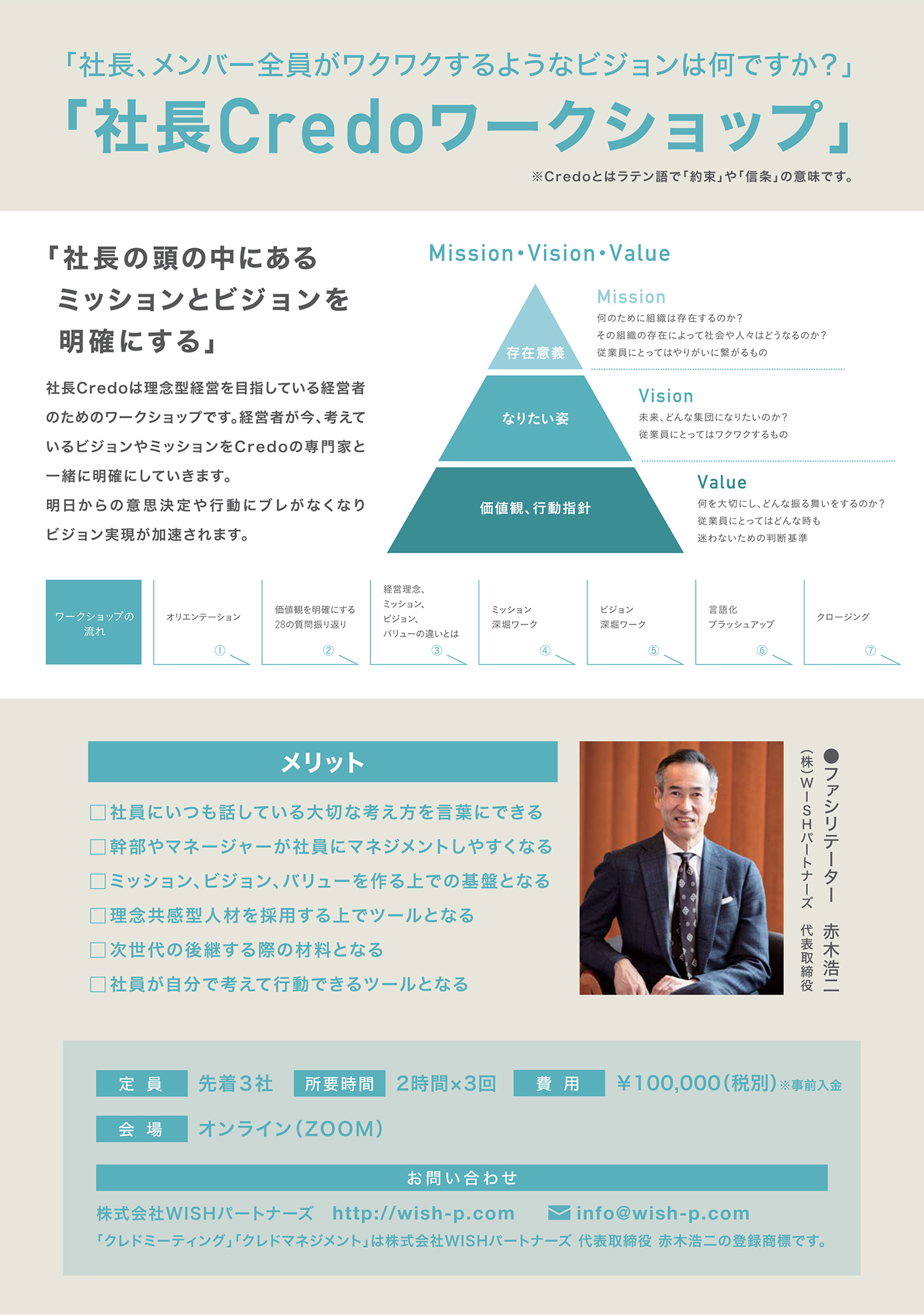この度は社長CREDOワークショップにお申込み頂きありがとうございます。お支払いはクレジットカード、銀行振込の2種類です。 (1)カードの場合は以下よりご決済下さい。 https://www.paypal.com/cgi-bin/webscr?cmd=_s-xclick&hosted_button_id=ZWVRZ3JPBX7UU (2)銀行振込は以下よりお手続き下さい。 住信SBIネット銀行 法人第一支店 口座番号 1441908 株式会社WiSHパートナーズ代表取締役赤木浩二 お申し込み後、5日以内にお手続き頂ければ幸いです。 決済が完了しましたら営業日で2日以内に今後のスケジュールをご連絡させて頂きます。よろしくお願いいたします。